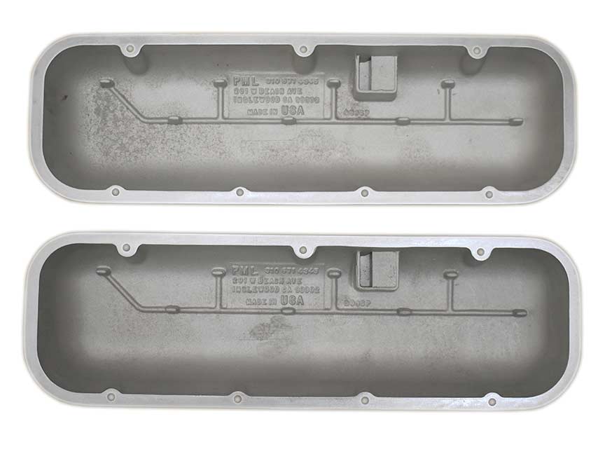 PML Chevy big block valve covers have PCV and oil fill/breather holes and baffles cast into the covers. The internal baffles help prevent oil blow-by out the PCV and breather holes. Either of these holes can also be used for oil fill by removing the PCV valve or breather.