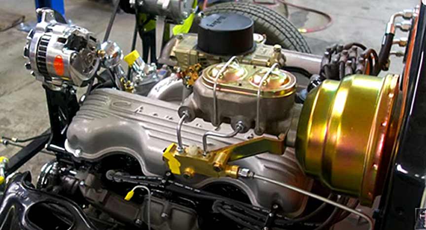 The engine is a 440 cubic inch 409 wth Hilborn fuel injection, Edelbrock heads, eagle crank, H-beam rods, custom ground roller cam and Billet Specialties pulleys. They machined the stacks and the thermostat housing.