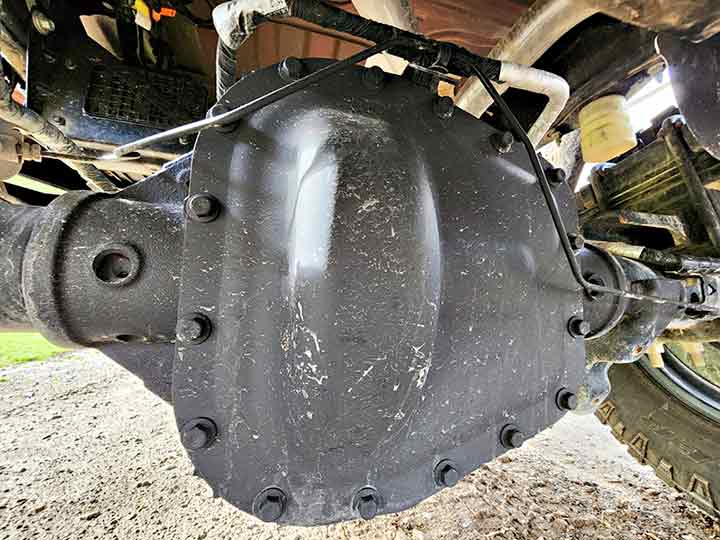 The rear differential cover on a 2024 Ford Super Duty truck: