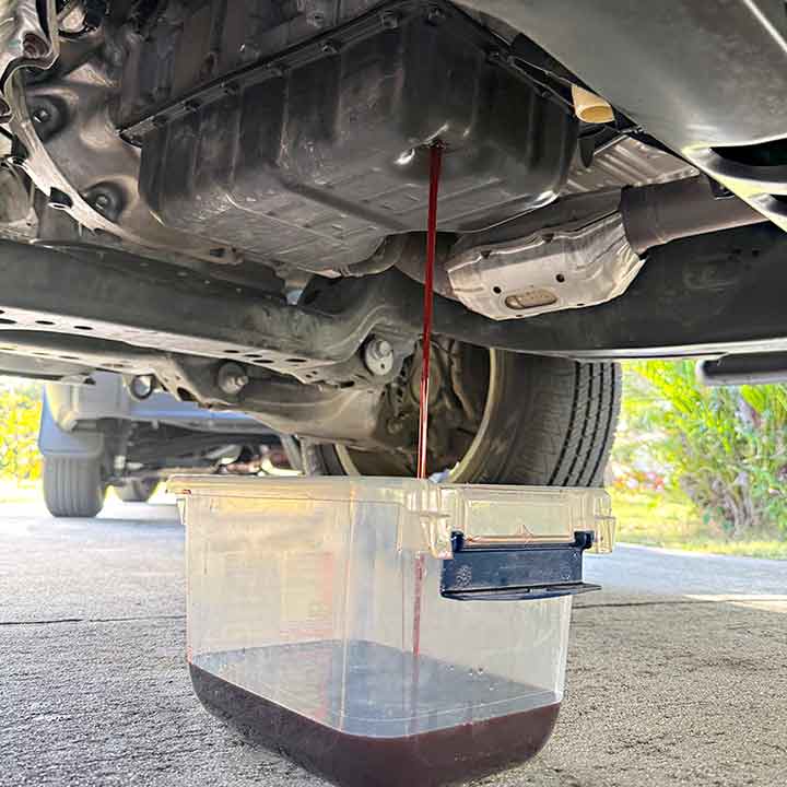 Drain: On left/driver side of pan at the bottom for complete draining.